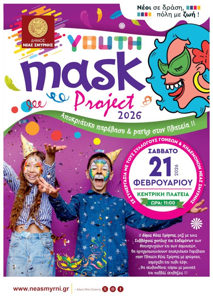 Το Σάββατο 21/2 οι μαθητές των Νηπιαγωγείων και των Δημοτικών Σχολείων της πόλης θα παρελάσουν με τα αποκριάτικα κοστούμια τους στην πιο διασκεδαστική παρέλαση. Ο Δήμος Νέας Σμύρνης υπόσχεται χρώματα, χαμόγελα, χορό, αποκριάτικες εμφανίσεις και ανεξάντλητο κέφι. Στο Youth Mask Project που πραγματοποιείται με την συνεργασία των Συλλόγων Γονέων και Κηδεμόνων των Σχολείων μας οι μικροί αλλά και οι μεγάλοι καρναβαλιστές θα δώσουν βροντερό παρόν και θα ξεφαντώσουν στη συνέχεια στο πάρτι που θα ακολουθήσει με μουσική και χορό. Ώρα έναρξης 11:00