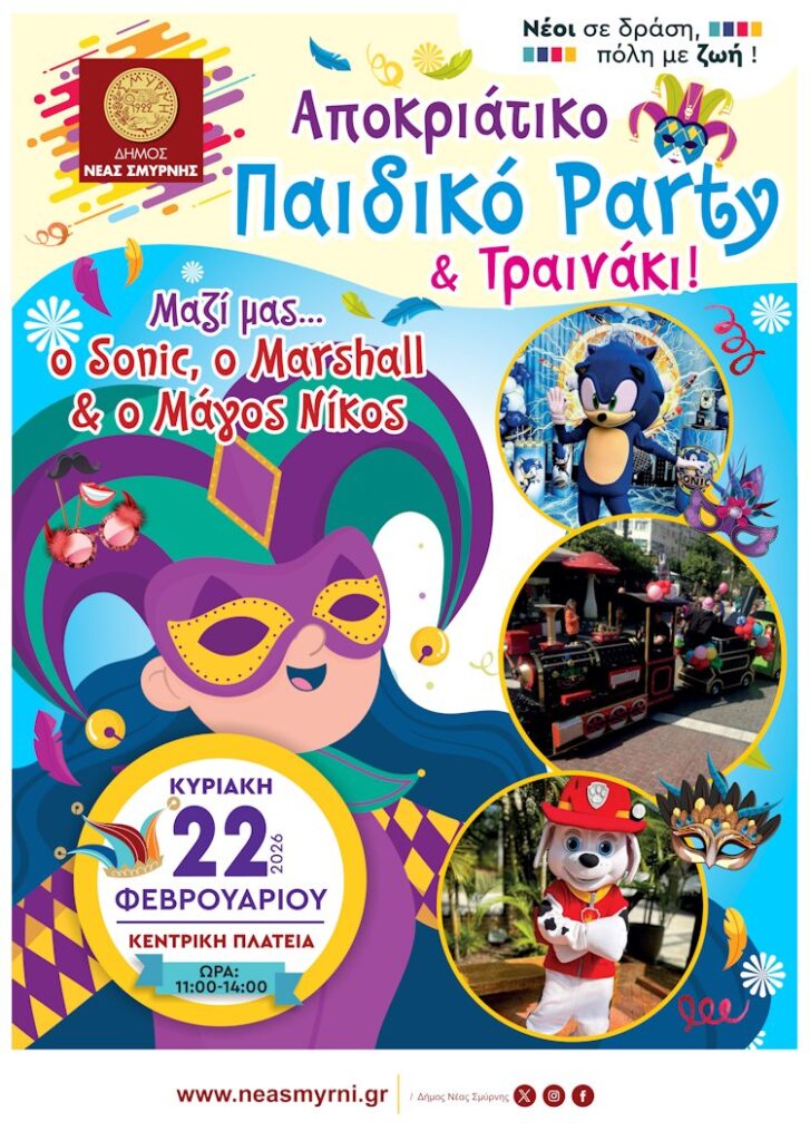Την Κυριακή 22/2 οι εκδηλώσεις του Δήμου Νέας Σμύρνης κορυφώνονται μ’ ένα μεγάλο Αποκριάτικο παιδικό πάρτι και διαδρομές με το πιο χαρούμενο τρενάκι της πόλης.