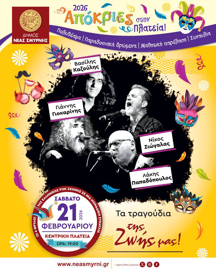 Το απόγευμα του Σαββάτου 21/2 τέσσερα από τα μεγαλύτερα ονόματα της Ελληνικής ροκ σκηνής ανταμώνουν στην Πλατεία στην μεγάλη Αποκριάτικη συναυλία του Δήμου Νέας Σμύρνης για να μας χαρίσουν τα αγαπημένα τους τραγούδια και πολύ κέφι! Οι Λάκης Παπαδόπουλος, Νίκος Ζιώγαλας, Βασίλης Καζούλης και Γιάννης Γιοκαρίνης ενώνουν τα μικρόφωνα και τις φωνές τους για να ερμηνεύσουν “Τα τραγούδια της ζωής μας” με τον μοναδικό τους τρόπο. Ώρα έναρξης 19:00