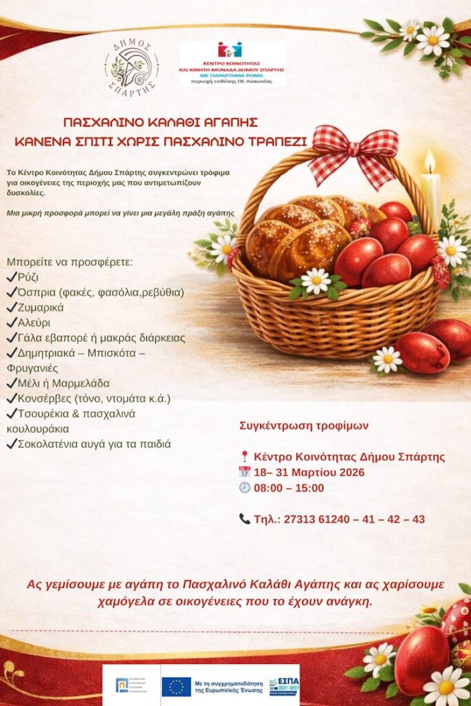 Κίνηση στήριξης και αλληλεγγύης αποτελεί το «Πασχαλινό Καλάθι Αγάπης» που διοργανώνει και φέτος το Κέντρο Κοινότητας του Δήμου Σπάρτης, προκειμένου να ενισχύσει τους ευάλωτους συνδημότες της πόλης, τις Άγιες ημέρες του Πάσχα.