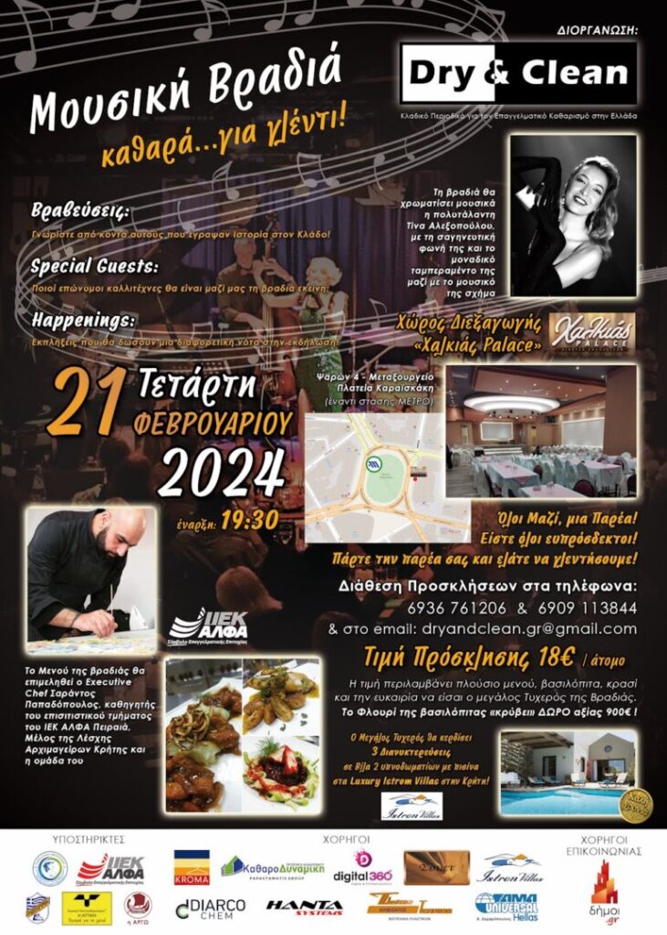 Το Δήμοι.gr όντας χορηγός επικοινωνίας στην ετήσια εκδήλωση που διοργανώνει το κλαδικό περιοδικό Επαγγελματικού Καθαρισμού Dry & Clean φιλοξενεί το Δελτίο τύπου που εξέδωσε το περιοδικό για την μοναδική βραδιά που ετοιμάζει. Καλό φαγητό, κρασί, μουσική και διασκέδαση είναι μόνο μερικά από τα συστατικά που θα περιλαμβάνει η μουσική εκδήλωση "Καθαρά για Γλέντι".