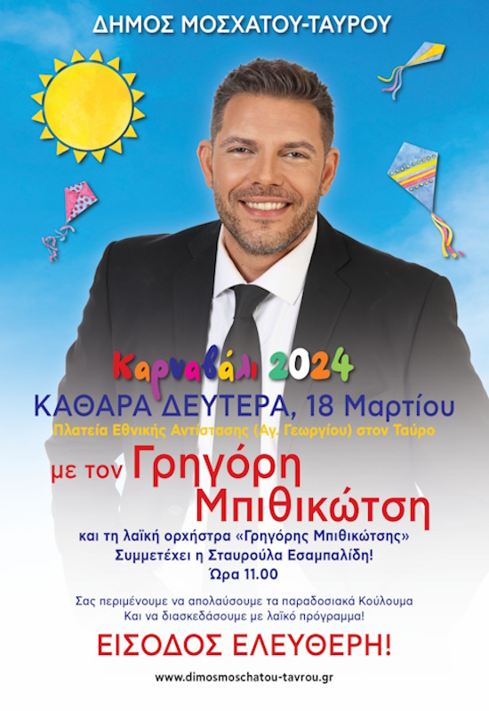 Ο Δήμος Μοσχάτου-Ταύρου συνεχίζει τις εορταστικές εκδηλώσεις του με τη συναυλία του Γρηγόρη Μπιθικώτση και τη λαϊκή του ορχήστρα την Καθαρά Δευτέρα, στις 18 Μαρτίου, στις 12 το μεσημέρι, στην πλατεία Εθνικής Αντίστασης (Αγ. Γεωργίου) στον Ταύρο.