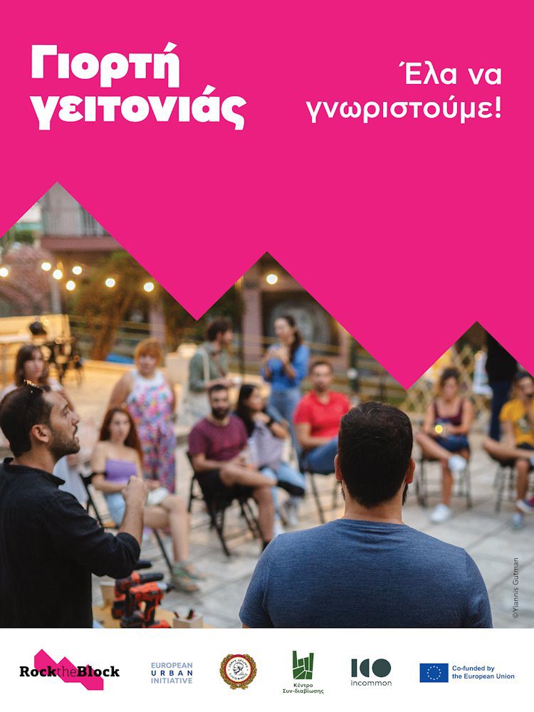 Το Ευρωπαϊκό Πρόγραμμα Rock the Block προσκαλεί τους κατοίκους του Αιγάλεω σε μια ανοιχτή γιορτή γειτονιάς, με στόχο τη γνωριμία, τη σύνδεση και την ενδυνάμωση των σχέσεων στην κοινότητα, καθώς και την ενημέρωση για τις επερχόμενες δράσεις αστικής ανάπλασης και βιωσιμότητας.